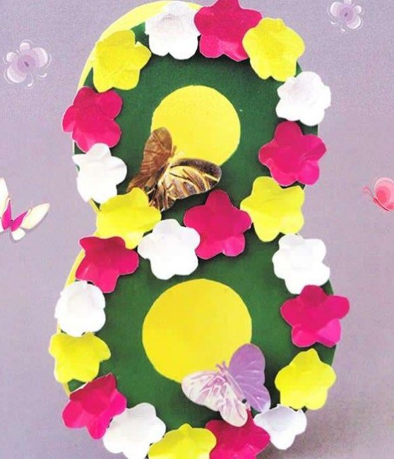 Следующий подарок подойдет девочкам на 8 Марта, которые посещают 2 класс. Сделать открытку, которая будет представлена ниже достаточно просто. В работе вам понадобится яркий картон и цветная бумага.
