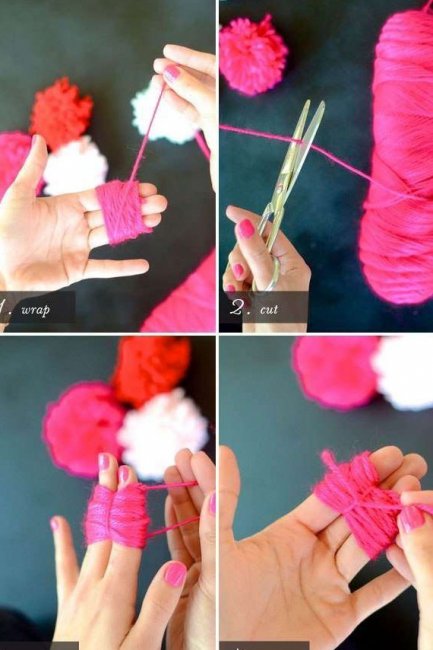 - Наш букетик будет состоять из помпончиков. Поэтому нить обматывают вокруг пальцев около 75 раз. Чтобы сделать большой помпон нить обматывают вокруг 4-х пальцев. Для маленького помпона понадобится 3 пальца. Намотали на палец нужное количество витков, тогда отрежьте нить.
