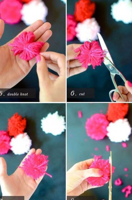 - Поправьте нити для того, чтобы помпон стал пышным. Сделайте помпон ровным. Подрежьте лишние нити.