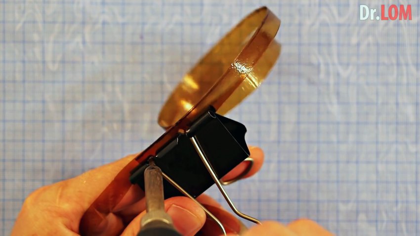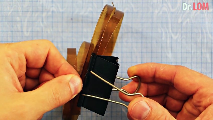 Концы лент необходимо сложить вместе внахлест. Чтобы они держались, сбоку по краю их можно зафиксировать биндером.