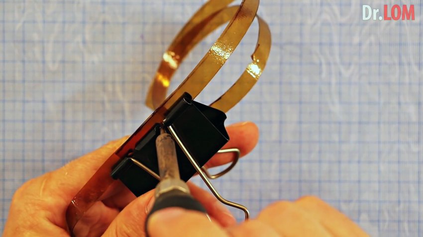 Распустив ПЭТ бутылку бутылкорезом можно получить длинную ленту. Но и ее длины бывает нахватает. В таком случае можно соединить несколько коротких кусков применив паяльник.
