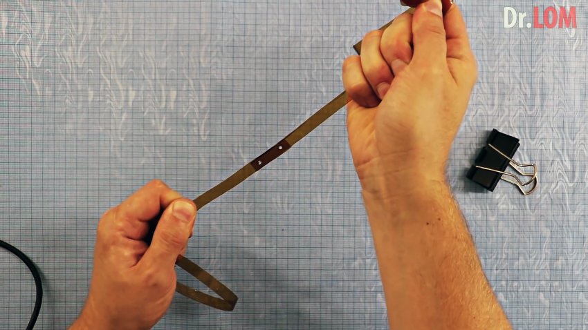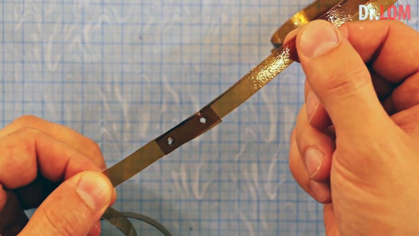 Теперь берем паяльник с тонким жалом или разогретое шило, и прожигаем в сдвоенной части ленты отверстие.