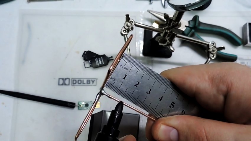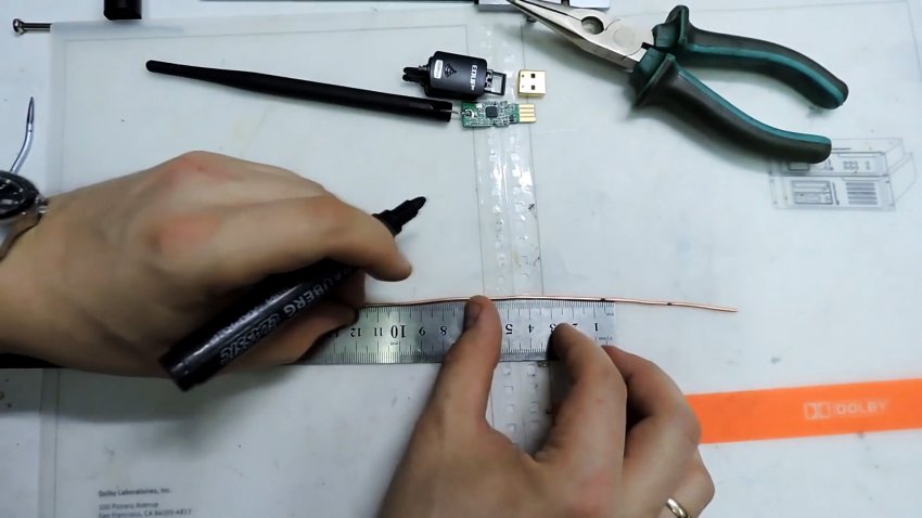 Чтобы сделать дальнобойную антенну используем медную проволоку. Сперва выравниваем ее и маркером размечаем на ней 8 отрезков по 3 см каждый.
