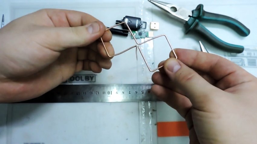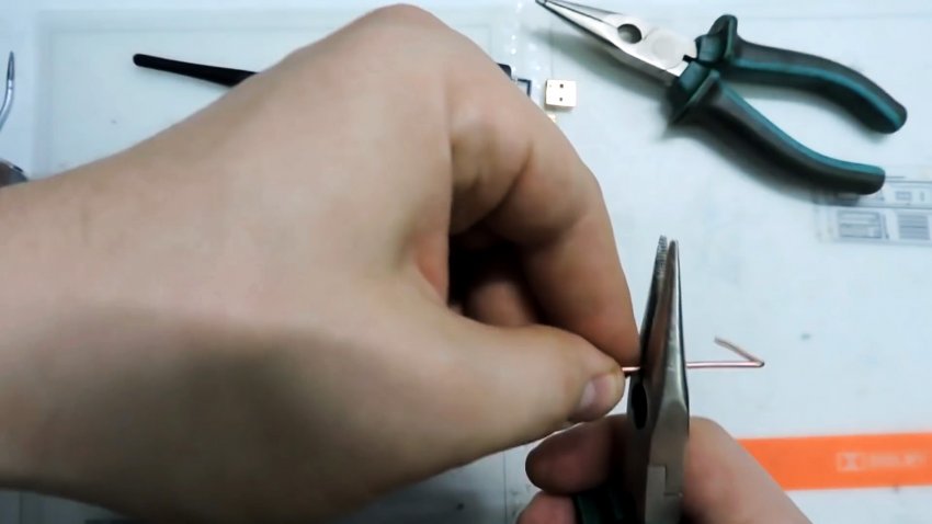 Основание загибаем в обратную сторону, как показано на фото — это будет стойка для нашей антенны. Дополнительно выравниваем места сгиба плоскогубцами, чтобы все было идеально ровно.