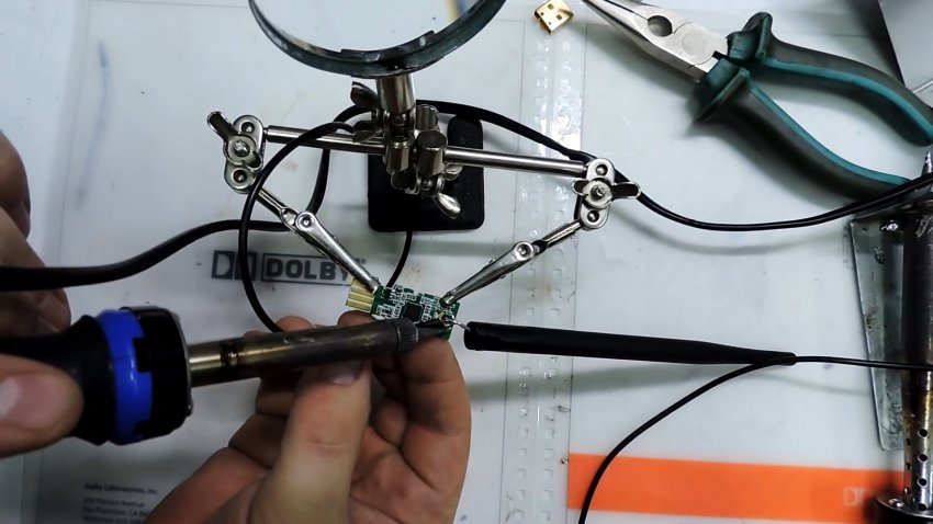 Теперь продеваем ее в отверстие и на месте отметки хорошо припаиваем. Торчащую часть стойки можно обрезать кусачками.
