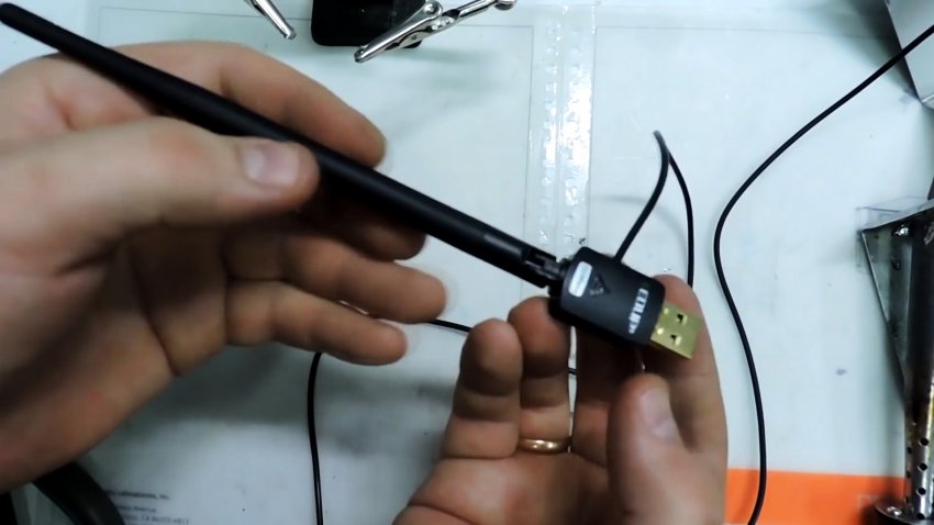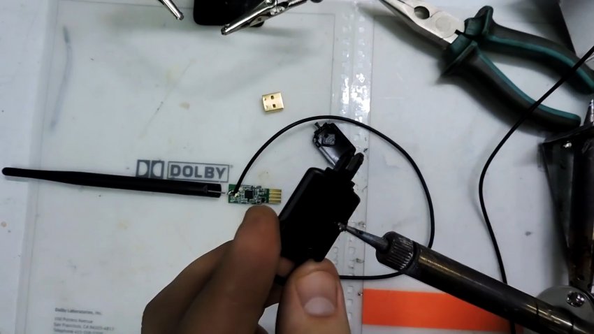 В корпусе USB адаптера паяльником делаем отверстие для провода дополнительной антенны. Лишний пластик убираем ножом.