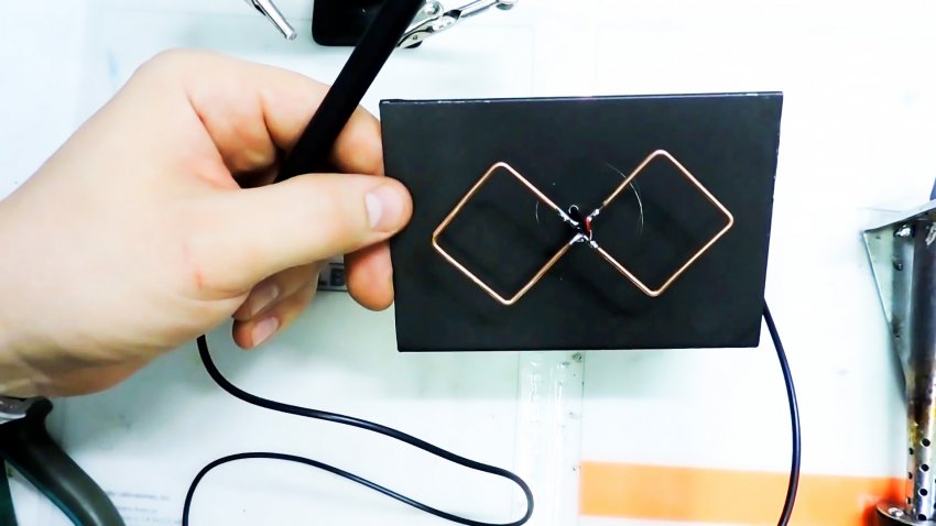 Продеваем коаксиальный кабель во второе отверстие и припаиваем одну жилу к стойке, другую к концу контура. Жилы на другом конце припаиваем к проводу уже имеющейся антенны.