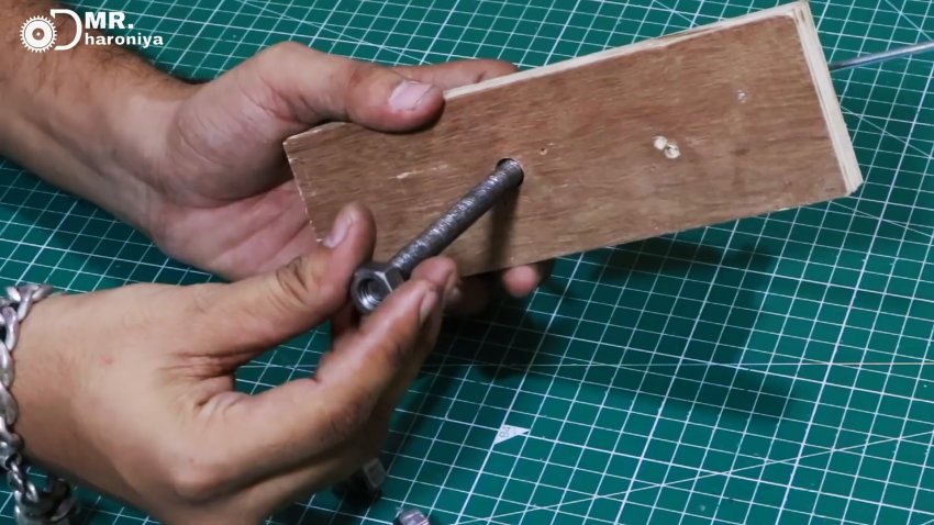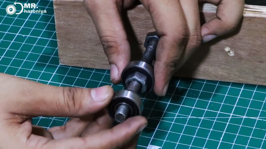 Далее нужно позаботиться об установке ветрогенератора на поворотную веху. Для этого фанера просверливается, и на нее нажимаете болт. На него нужно поставить и поджать гайками 2 подшипника.