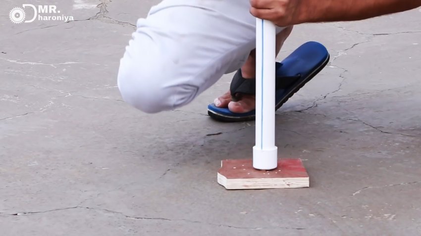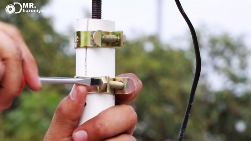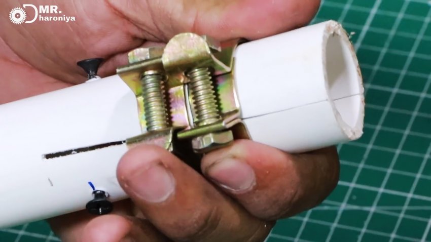 Сама веха делается из пластиковой трубы. С краю ее нужно надрезать вдоль, чтобы вставить внутрь болт с подшипниками, и затем зажать их хомутом. Таким образом, получается поворотное соединение. Такую веху можно будет вставлять в прикрученную заглушку.