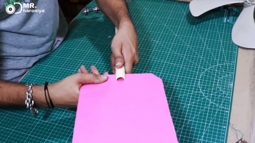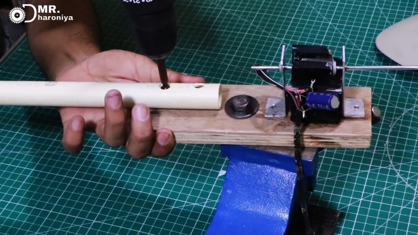 Чтобы ветряк поворачивался за ветром, понадобится сделать для него хвост. Для этого к фанере крепится тонкая пластиковая трубка, на конце которой устанавливается лопасть из листового пластика.