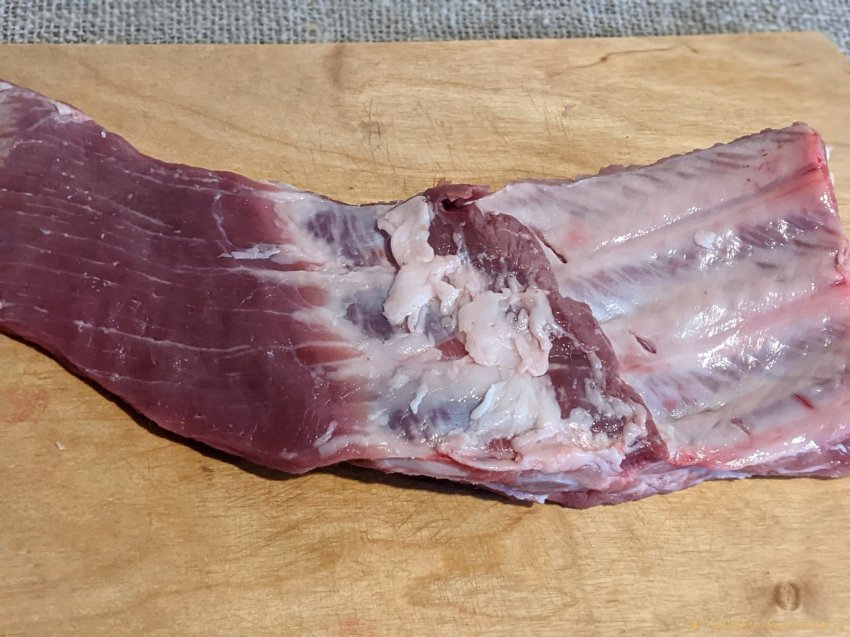 Если вы купили грудинку с косточкой, то её надо срезать.