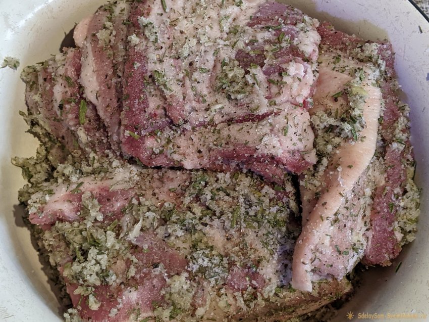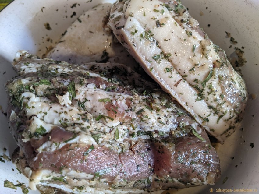 Каждый кусок грудинки со всех сторон обмазать чесночной смесью и сложить в эмалированную или стеклянную миску.