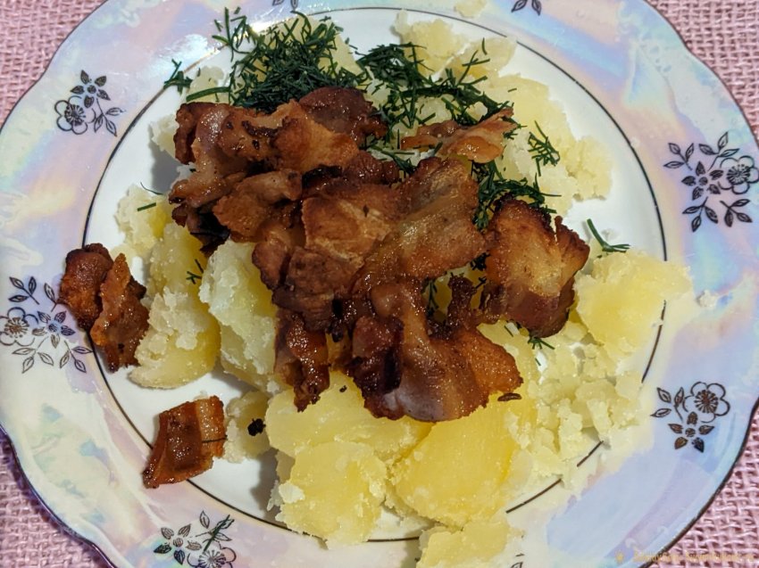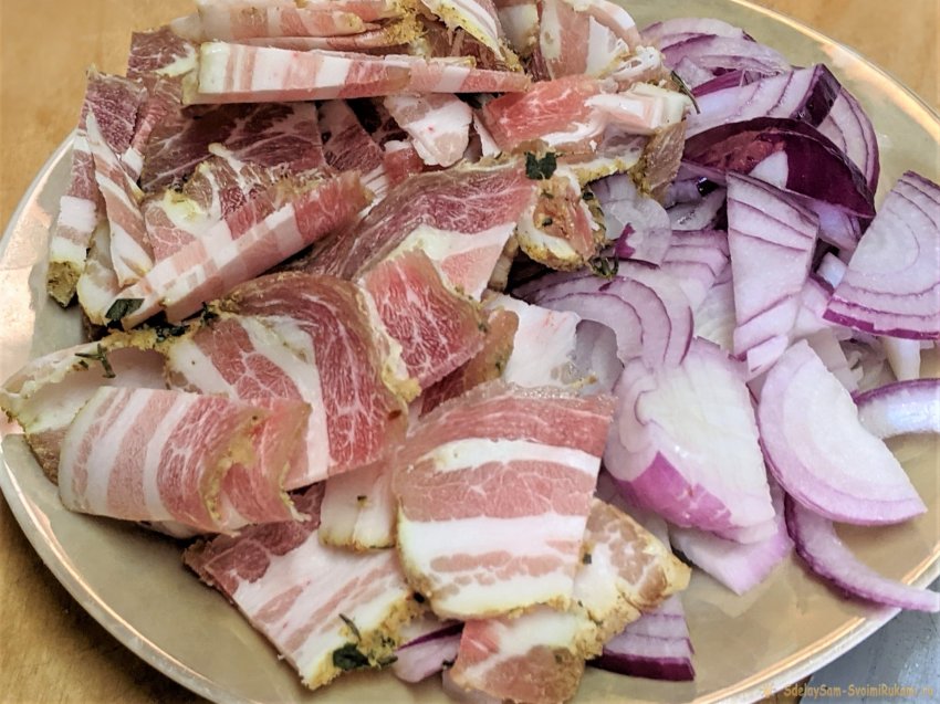 А ещё вся моя семья обожает чипсы из грудинки. На сухой сковороде со всех сторон обжарить тонко порезанную грудинку и посыпать получившимися чипсами отварной картофель или кашу.