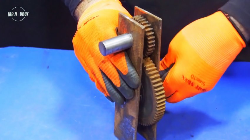 На ось большой шестерни приваривается ручка, выгнутая из тонкой полосы. Сама рукоять представляет собой тонкую трубку, надетую на палец из шпильки.