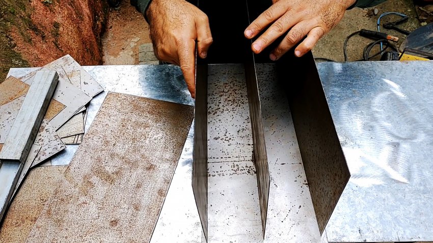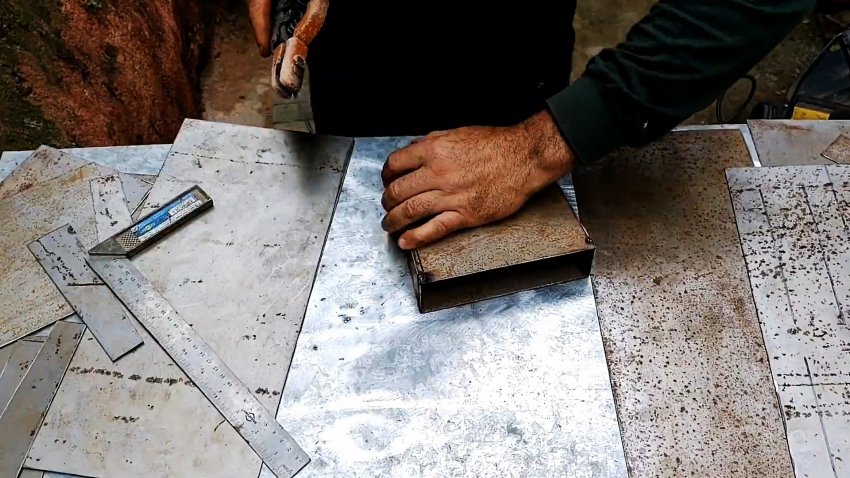 Из остатков листового металла вырезаем три прямоугольные пластины 19×39 см, две 19×18,5 см и одну 40×19,5 cм.