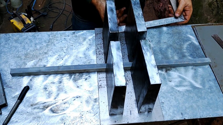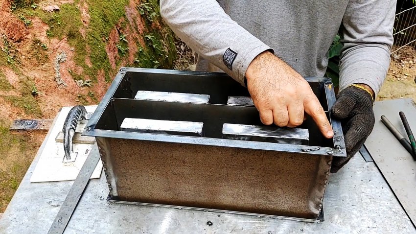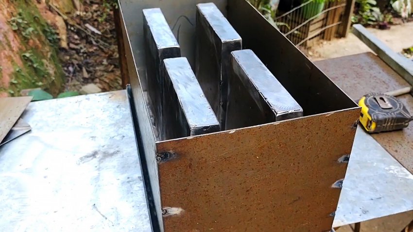 Расставляем на горизонтально уложенную пластину 40×19,5 см симметрично четыре короба широкой стороной вниз так, чтобы в середине расстояние между ними составляло в поперечном направлении 2,5 см, в продольном 4,3 см. Еще раз выверяем точность установки коробов и привариваем их к нижней пластине-основанию.