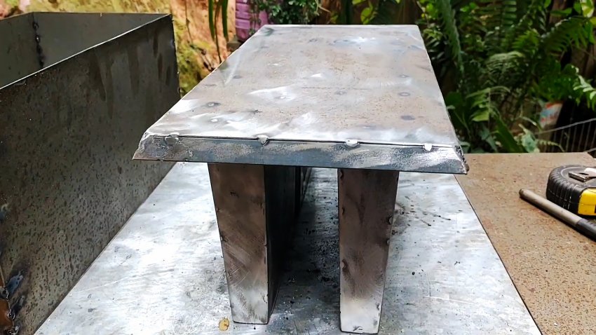 С внешней стороны к верхним торцам короба снаружи для жесткости привариваем стальные пластины. Укладываем короб на приваренные пластины и сверху накрываем основанием с косой отбортовкой.