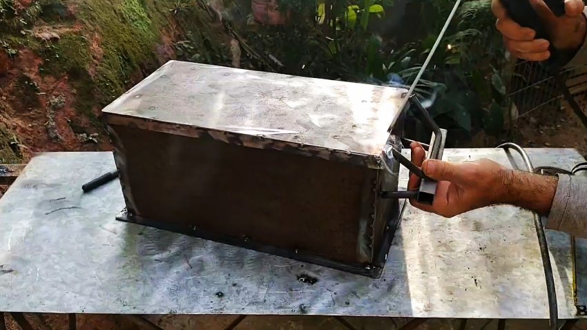 Привариваем с двух сторон к отбортовке согнутые в скобы ручки из круглых прутков или арматуры. Навстречу им с зазором 2 см привариваем точно такие же ручки к боковым сторонам короба.
