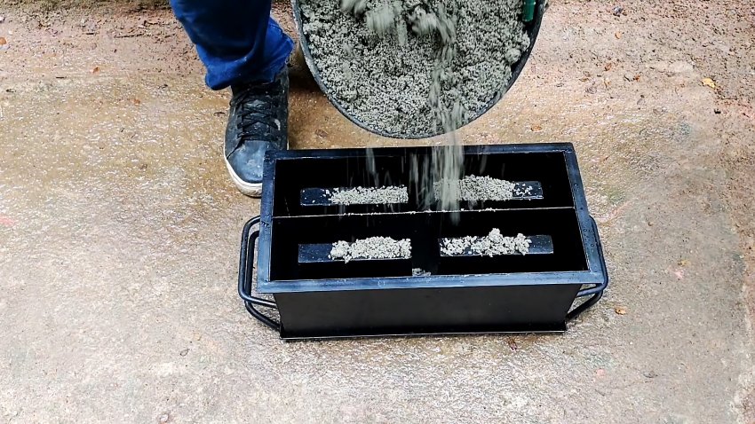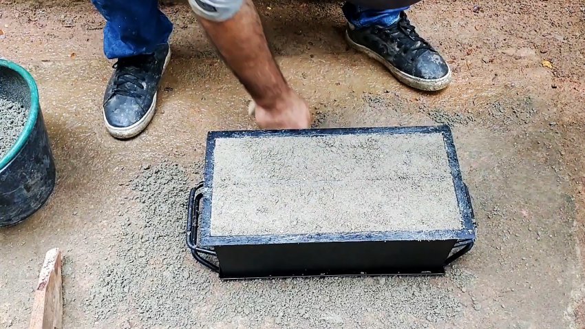После окончательного заполнения формы, переворачиваем ее и обстукиваем форму со всех сторон мастерком. Осторожно приподнимаем и убираем основание с формирователями отверстий в блоке.