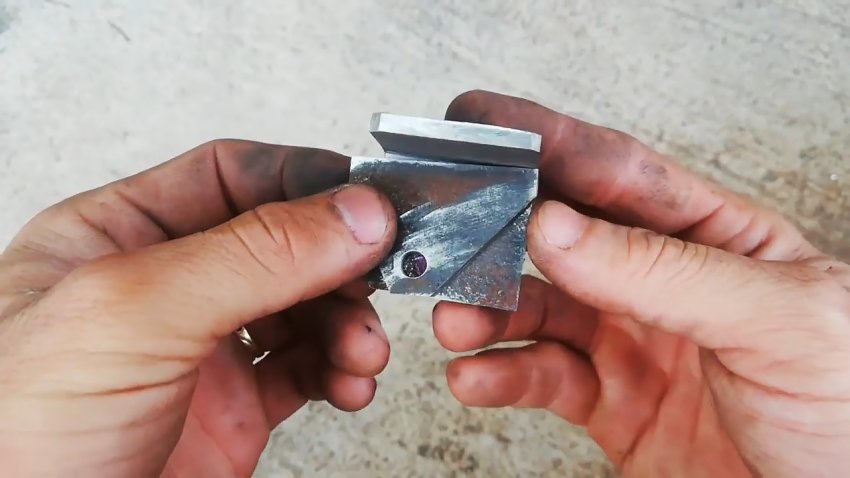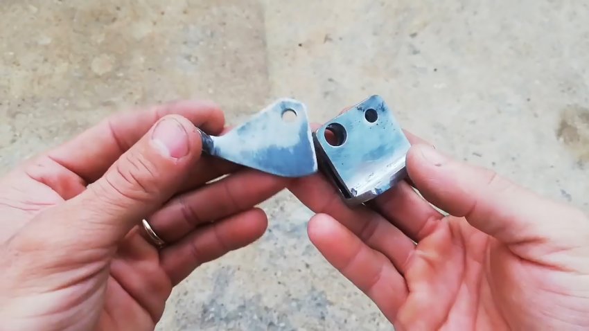 Согласно размеру детали из уголка выполняем сопрягаемую деталь из пластины: срезаем нижние углы и на конце сверлим отверстие. На нее укладываем шайбу и сверху прижимам квадратной пластиной, которую привариваем к вертикальной части детали из уголка.