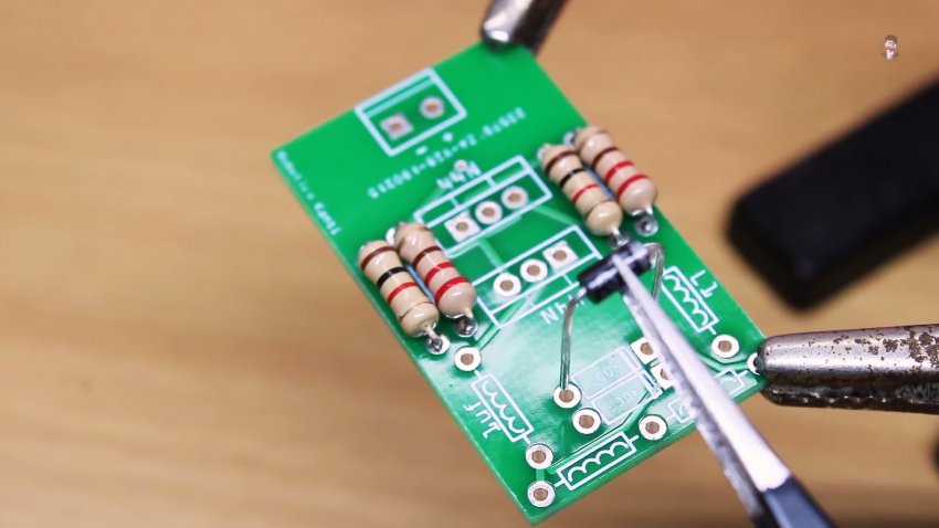 Сборка катушки будет осуществляться по представленной схеме. Для этого сначала подготавливается под нее печатная плата. В нее впаиваются 2 резистора 10 кОм и 2 на 330 Ом.