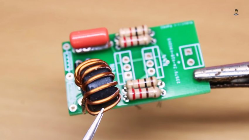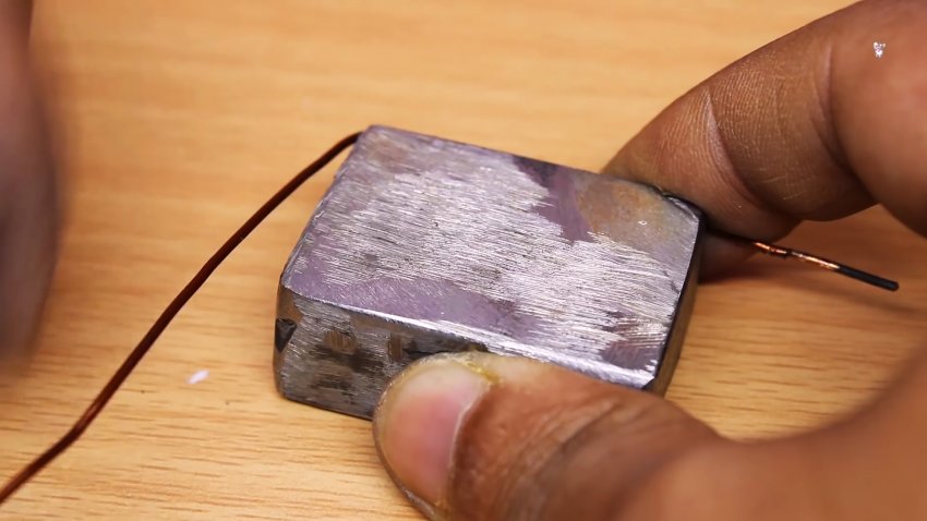Затем из металлического бруска нужно вырезать сердечник, и обмотать его медный эмалированной проволокой. Будет достаточно 10 витков. Катушка соединяется со схемой. Нужно оставить между ними зазор, чтобы плата не грелась от стального тела.