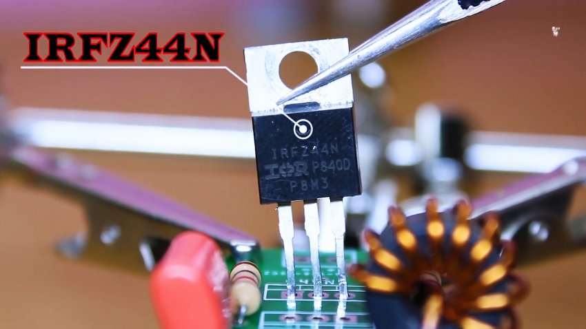 К плате припаивается согласно схеме 2 транзисторы IRFZ44N. Для их охлаждения устанавливаются алюминиевые радиаторы.
