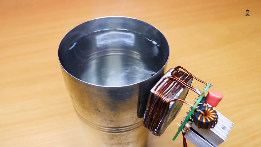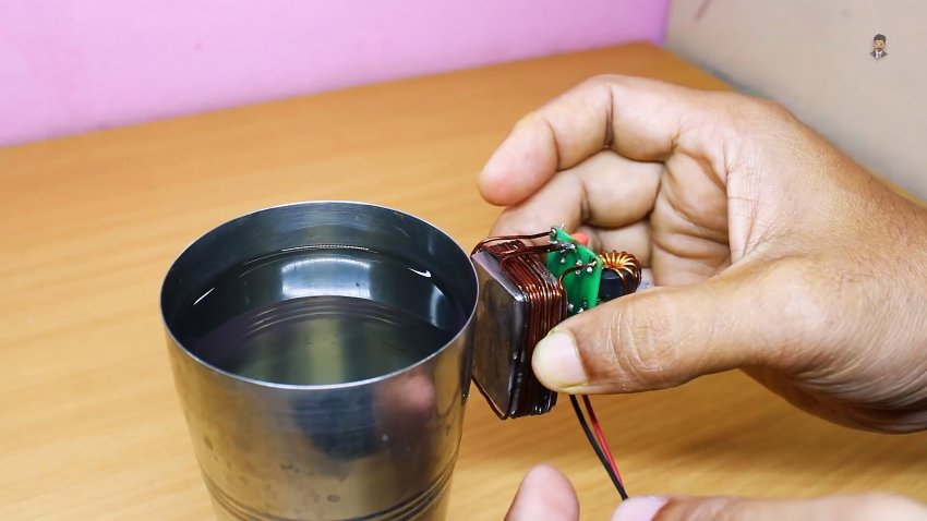 Индукционная катушка способна крайне быстро нагревать металлические предметы. Если собрать ее по предложенной схеме, то можно получить индукционный кипятильник для кипячения воды в стальной емкости типа чашки или кастрюли. Это вполне рабочее устройство, которому можно найти практическое применение.