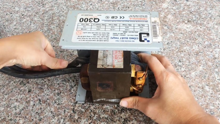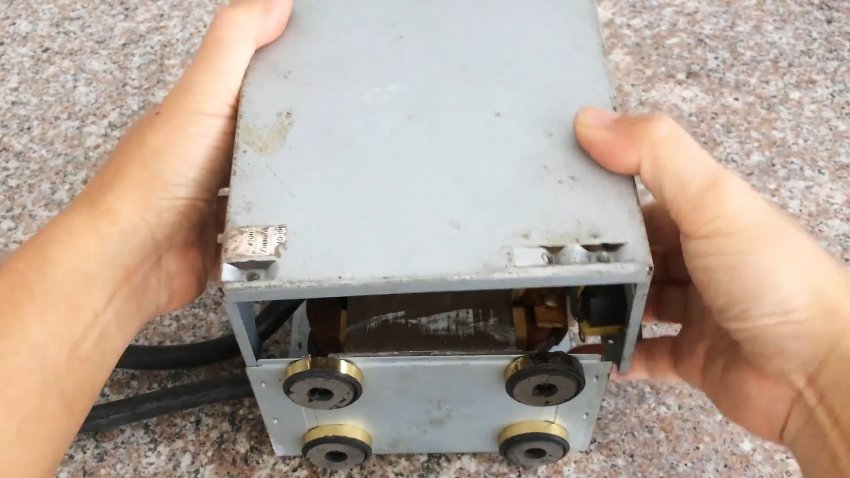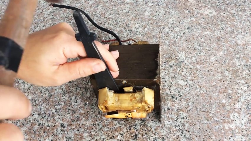Аккуратно извлекаем трансформатор магнетрона из микроволновки, чтобы не повредить первичную обмотку и магнитопроводы. Удаляем вторичную обмотку с помощью зубила, молотка и выколотки.