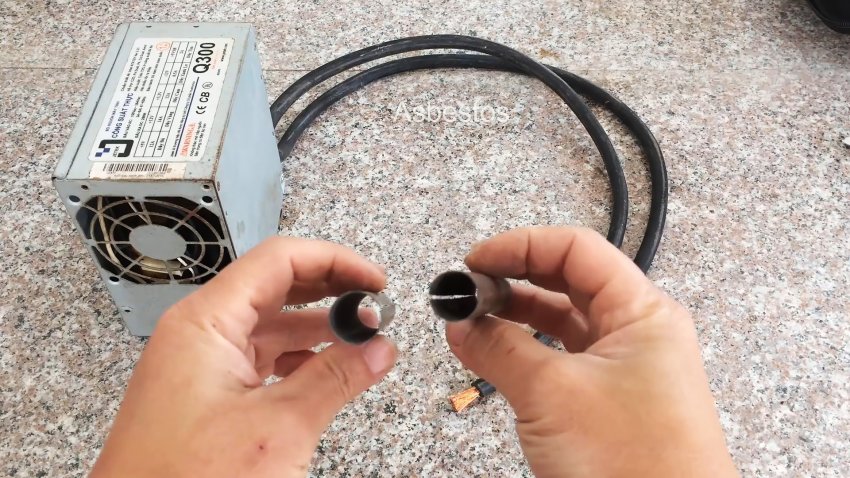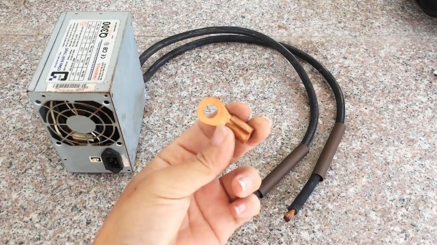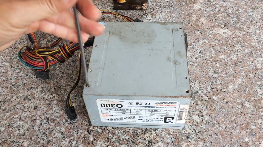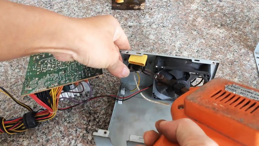 Из разобранного корпуса компьютерного блока питания извлекаем электронную «начинку», провода и вентилятор.
