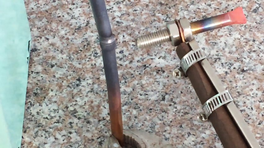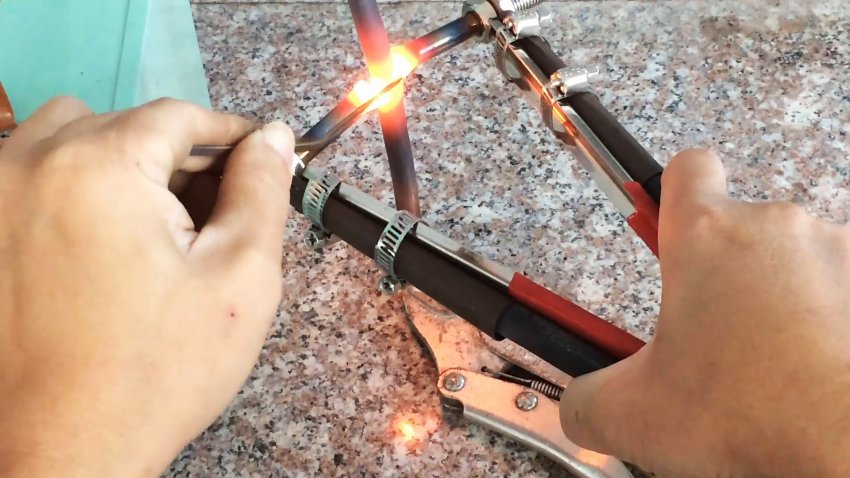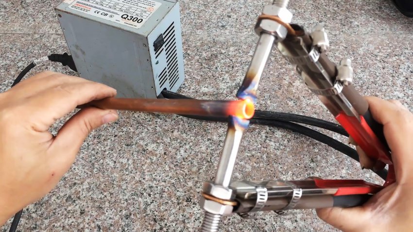 Подключаем питание, включаем переключатель, сжимаем ручки до соприкосновения электродов с медными трубками и разогреваем место пайки до белого свечения, добавляя припой. В результате получаем прочное, герметичное и надежное соединение.