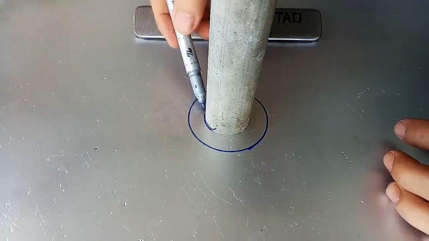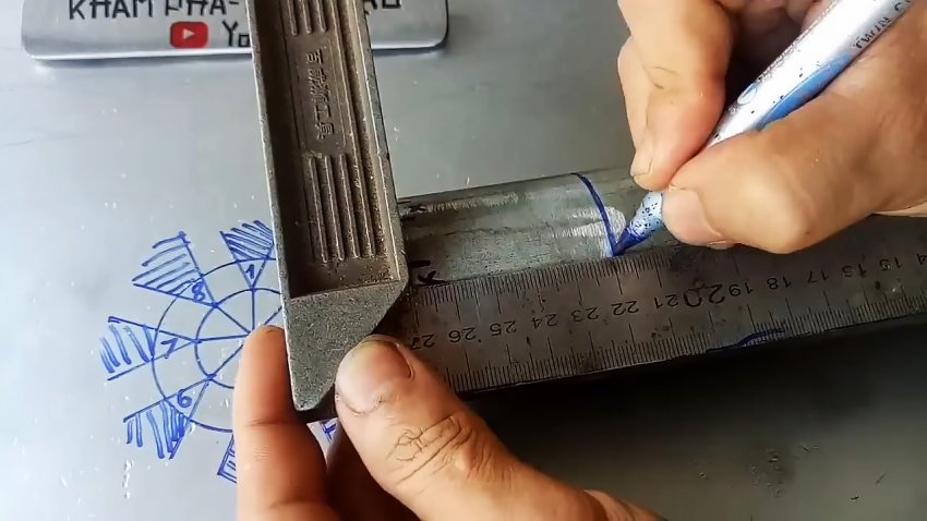 Устанавливаем трубу с большим диаметром на внешнюю окружность и отмечаем на ее образующей начало и конец каждого заштрихованного участка на рисунке. Отмечаем эти дуги на трубе крестиками.