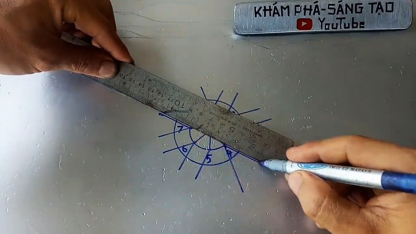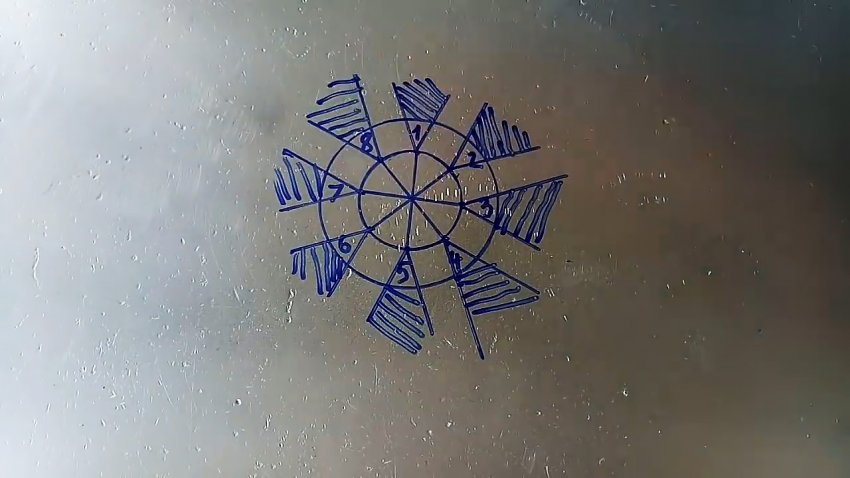 Нормируем точки пересечения концов диаметров с окружностью цифрами от 1 до 8. Затем поочередно прикладываем линейку к точкам 1 и 6, 1 и 4, 2 и 7, 2 и 5, 3 и 8, 3 и 6, 4 и 7, 5 и 8, и проводим от соединяемых линейкой точек прямые за пределы внешней окружности.