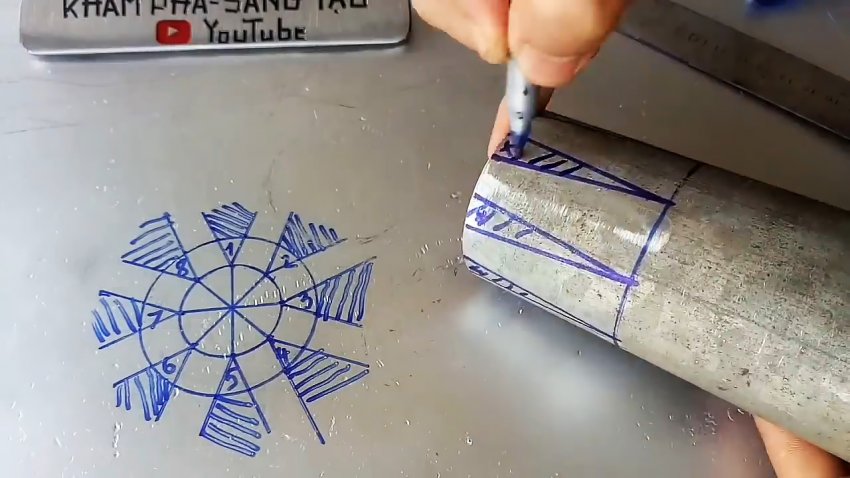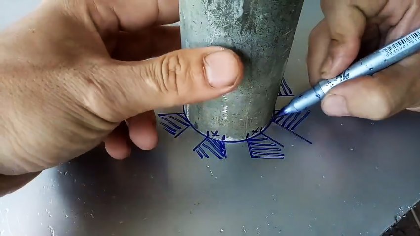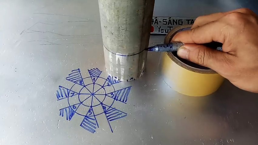 В результате на поверхности трубы получим 8 треугольников, которые вырезаем болгаркой.