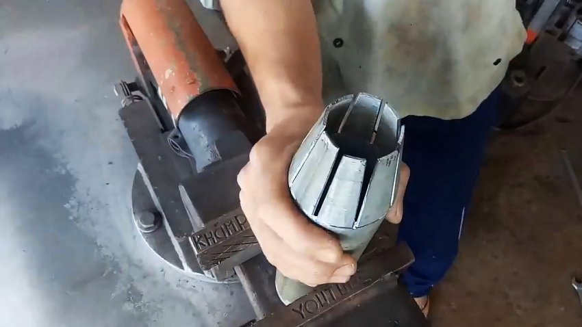Зажимаем трубу в губках тисков и, ударяя снаружи поочередно по «лепесткам» молотком, наклоняем их к центру. Окончательную изгибную доводку «лепестков» осуществляем плоскогубцами.