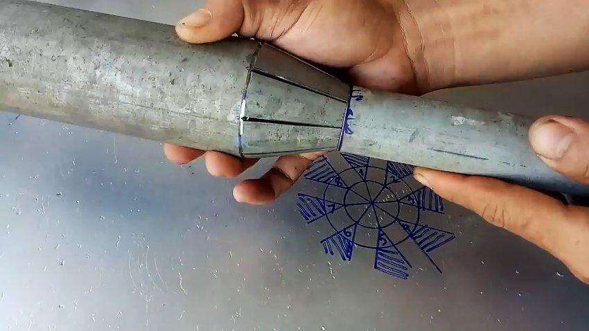 Приставляем конец трубы меньшего диаметра к восьмиугольнику, составленному «лепестками», и убеждаемся в их точном совпадении.