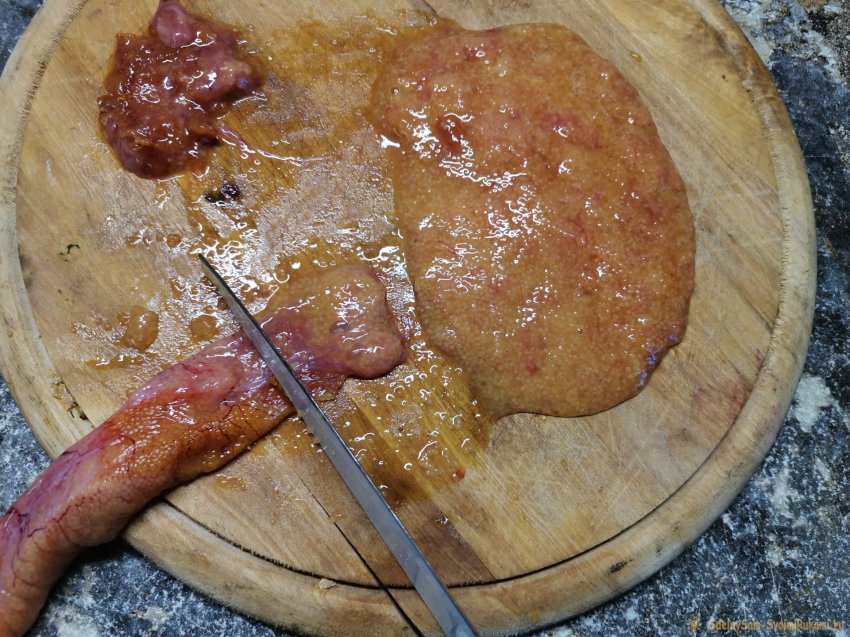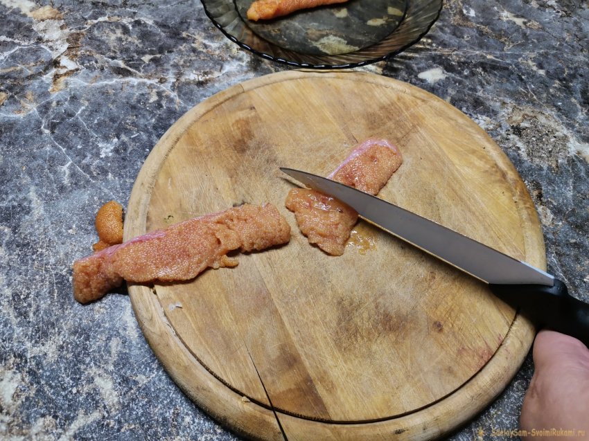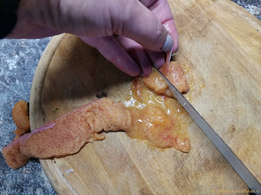 Разрезаем икрянку пополам. Обратной стороной ножа начинаем выдавливать икринки по направлению к разрезу.