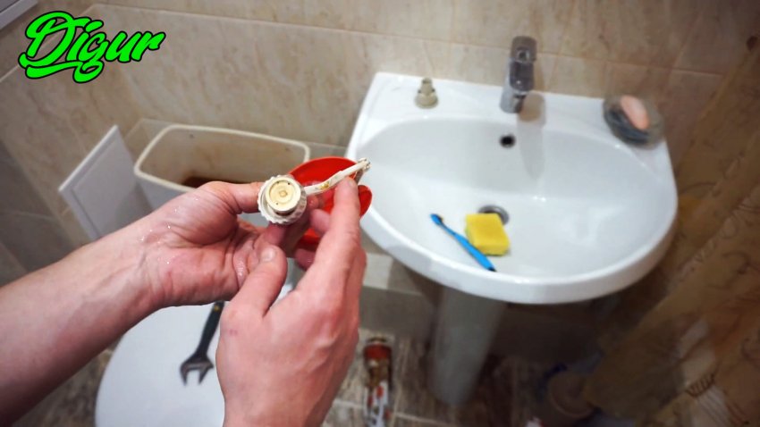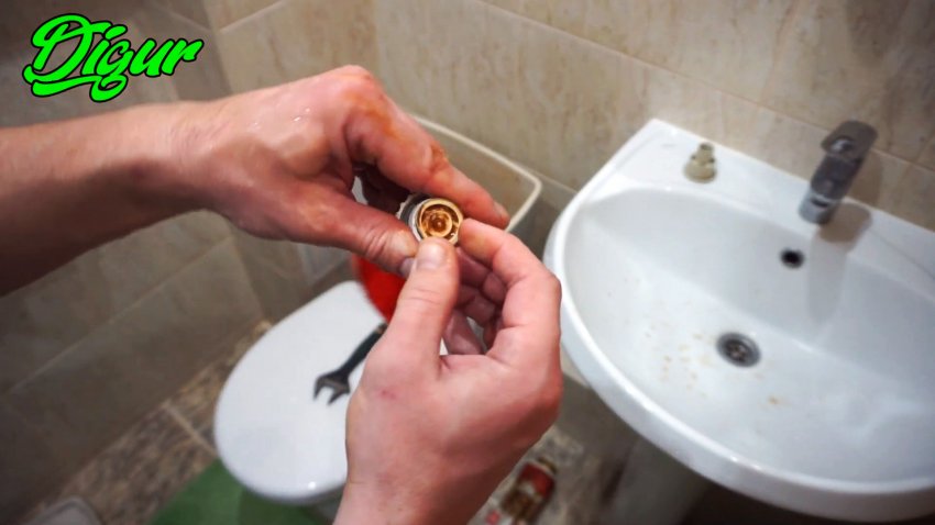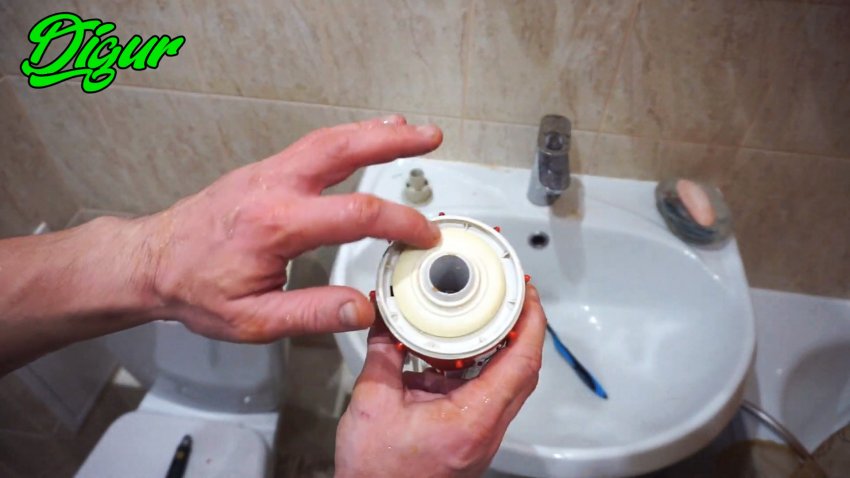 Вода не набирается, так как узкие отверстия в нем забиты отложениями. Нужно их пробить. Резиновую мембрану в нем следует вычистить зубной щеткой, чтобы она могла плотно прилегать к втулке. Важно все вымыть идеально. В противном случае вода будет набираться, но не сможет герметично перекрываться. Затем собираем заливную арматуру обратно.
