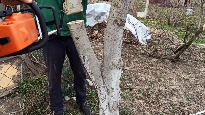 В конце марта старую яблоню нужно спилить садовой пилой. Лучше использовать именно ее, так как она оставляет чистый спил. От дерева оставляем пенек высотой 50-100 см.