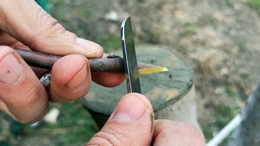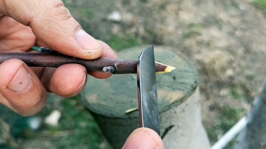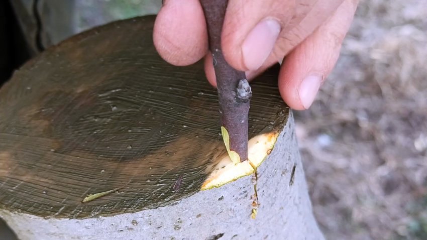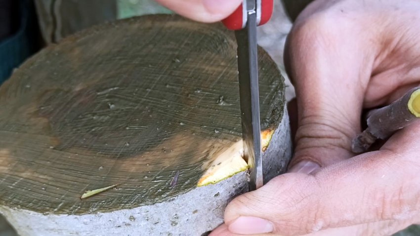 Затем на уровне камбия подвоя вгоняем лезвие сверху, чтобы отделить кору. В эту расщелину вставляем привой.