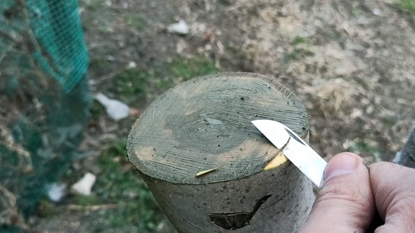 Затем подрезаем по кругу оставшуюся кору до зеленого камбия, как на фото.