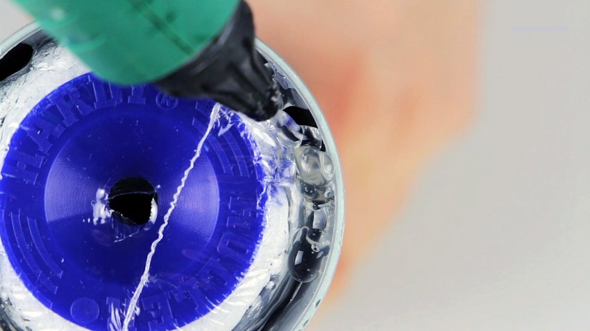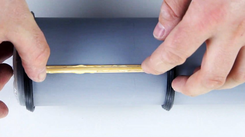 Вставляем в трубную заготовку малярный валик, состоящий из пустотелого цилиндра (катка), на который надета «шуба». Кольцевой зазор между трубой и валиком с двух сторон заполняем клеем из клеевого пистолета.