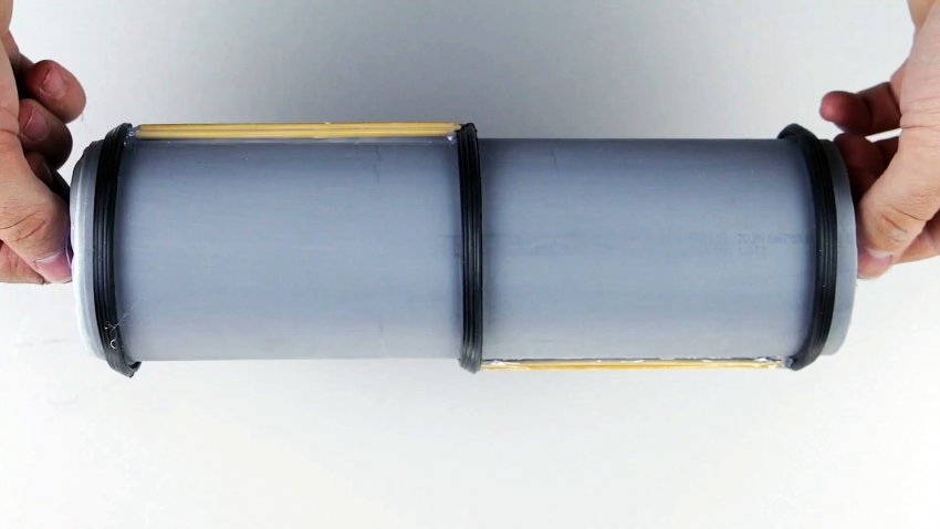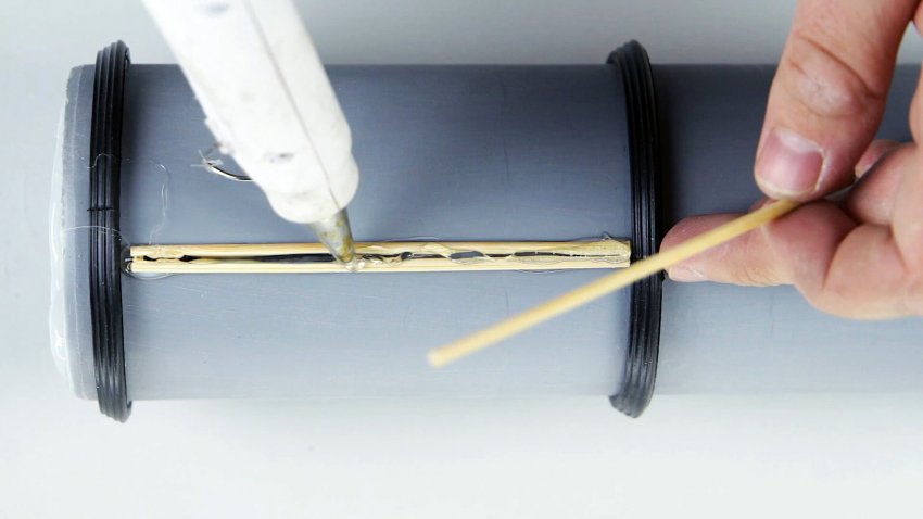 Проводим на поверхности трубы между центральным и боковыми уплотнительными кольцами продольные линии с поворотом трубы строго на 180 градусов. Наносим по проведенным линиям клей и прижимаем к ним по три укороченные под размер деревянные палочки, причем две рядом снизу и одну посередине сверху.