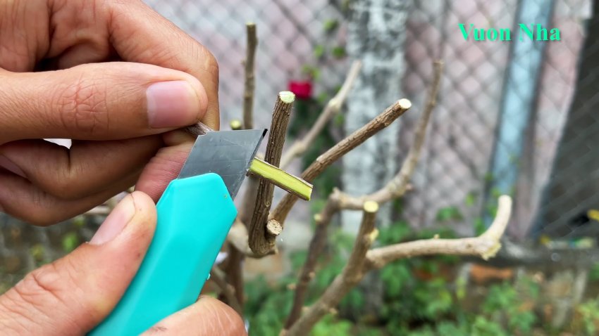 Почка при этом располагается сбоку относительно срезов. Теперь расщепляем ветку подвоя вдоль, и вставляем в расщелину заточенный привой.