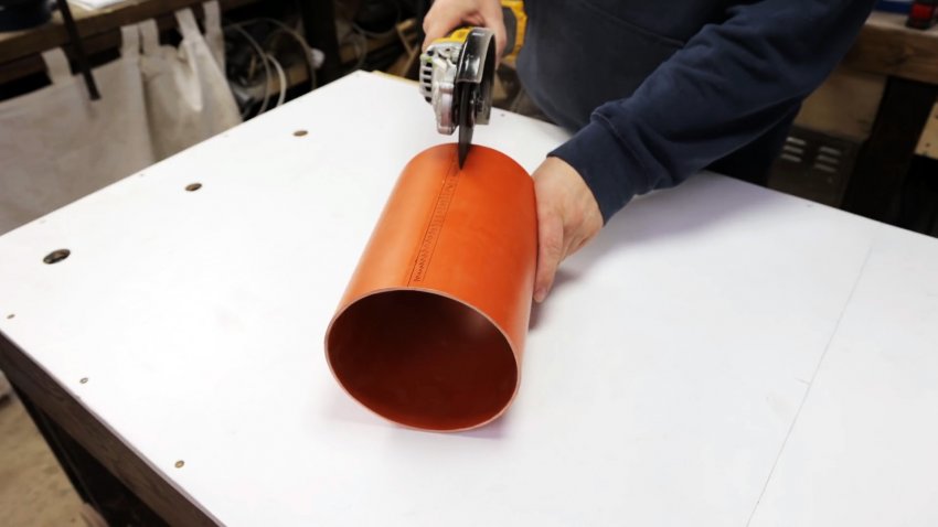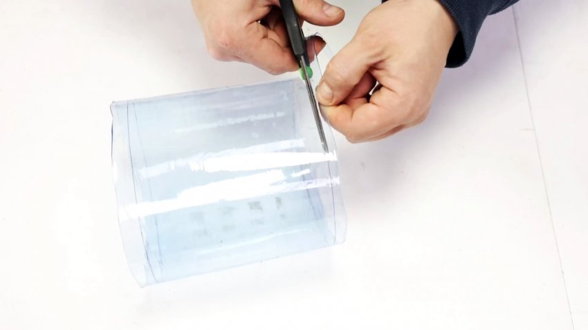 По пластиковой трубе проводим две образующие в 1 см друг от друга. Разрезаем трубу по образующим, вставив в нее кольцо того же диаметра.