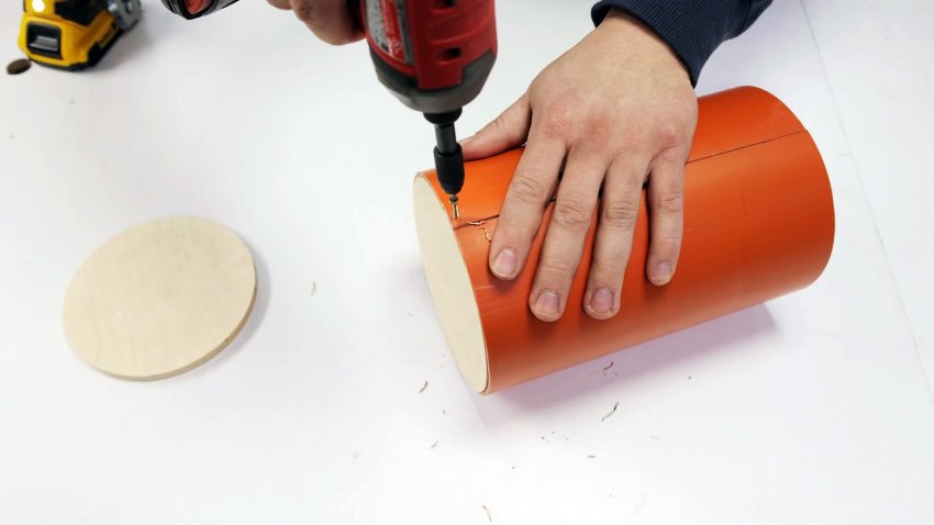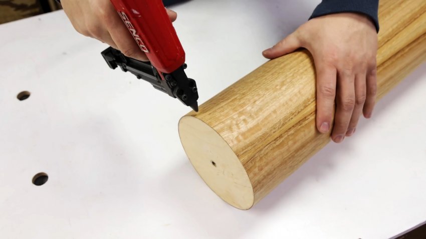 Гвоздезабивным пистолетом укрепляем соединение кругов, затем удаляем шпильку и гайки-барашки. Вставляем большой круг в торец трубы из шпона и пластика так, чтобы малый оказался внутри. Скрепляем их по окружности гвоздями.