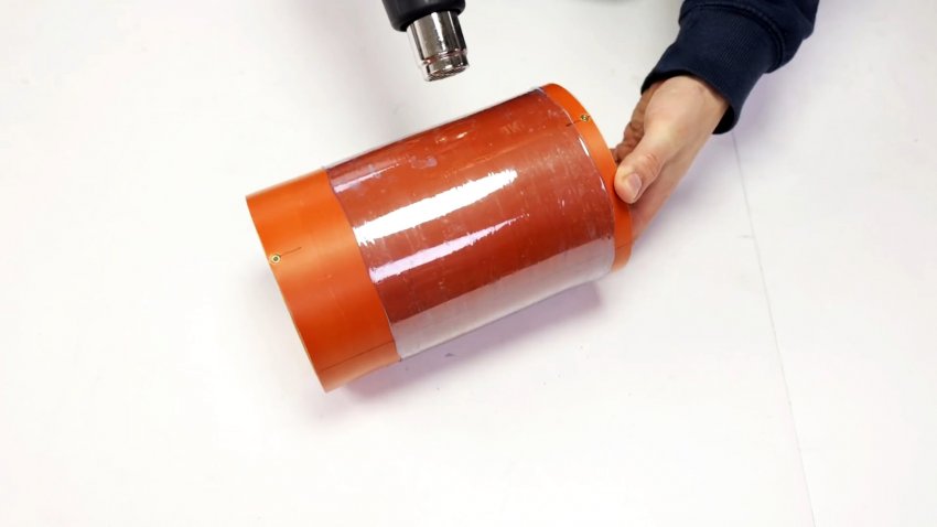 Надеваем на трубу с кругами центральную части бутылок. Нагреваем пластик феном до распрямления кольцевых ребер жесткости и плотного облегания трубы при термоусадке.