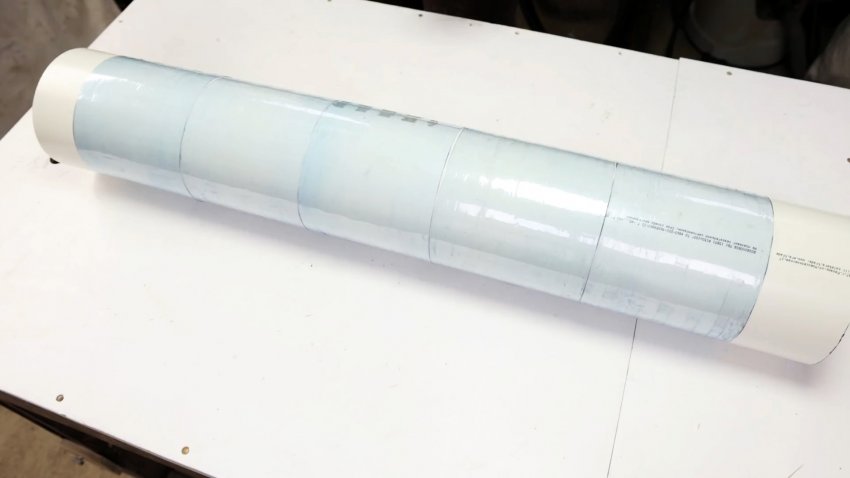 Выкручиваем шурупы и удаляем из трубы фанерные круги. Подравниваем торцы центральных частей пластиковых бутылок, сдвигая их к торцам трубы, и проводя линии реза, по которым отрезаем неровные концы трубы, полученной из бутылок.