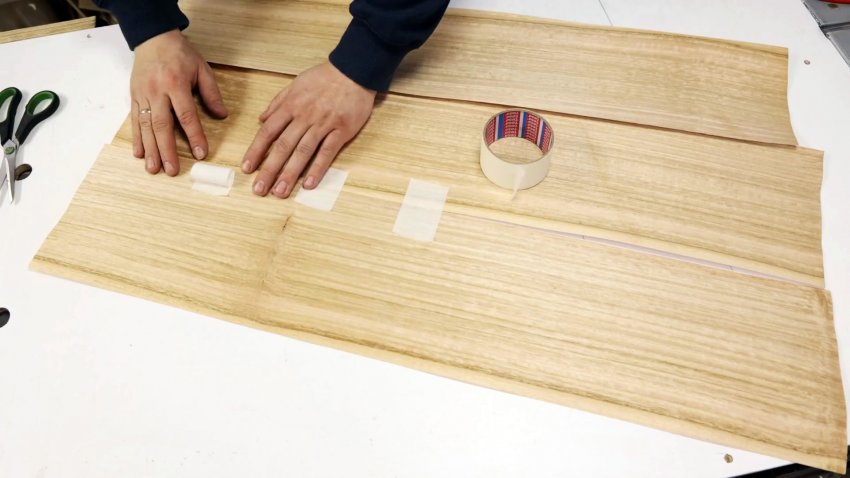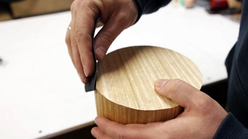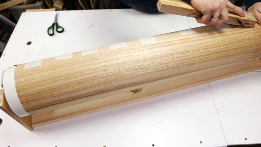 Покрываем тыльную сторону шпона и цилиндрическую поверхность из пластика клеем и склеиваем их между собой, прижимая деревянным бруском. Аккуратно снимаем скотч со шпона.