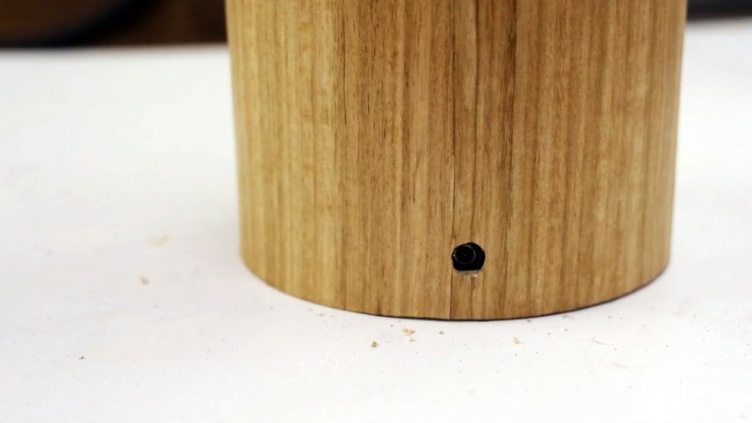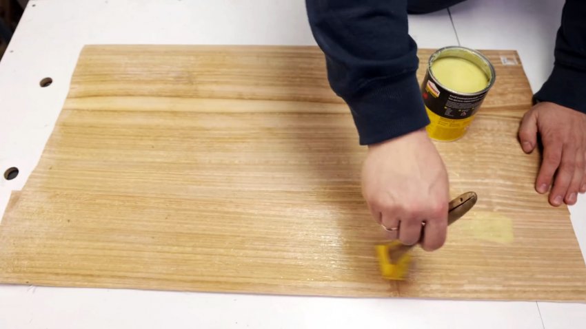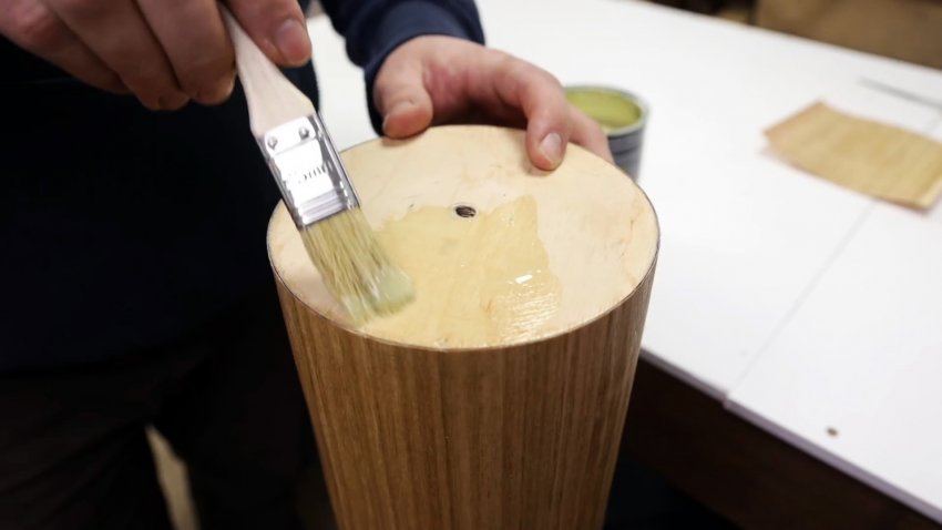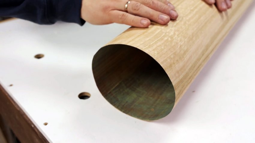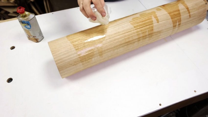 Удаляем из полученной трубы пластиковую трубу, а поверхность шпона покрываем пропиткой для дерева, растирая бумажной салфеткой.
